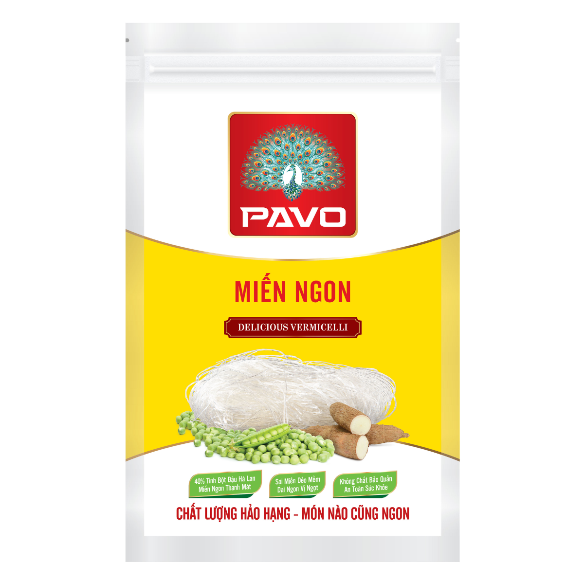 Miến ngon Pavo là dòng sản phẩm được sản xuất từ 100% nguyên liệu tự nhiên nhằm mang đến trải nghiệm ẩm thực trọn vẹn cho mọi gia đình Việt. Với công thức phối trộn khoa học từ 40% tinh bột đậu Hà Lan và 60% tinh bột khoai mì, sản phẩm tạo nên sợi miến đạt độ hoàn hảo cả về hình thức lẫn hương vị.