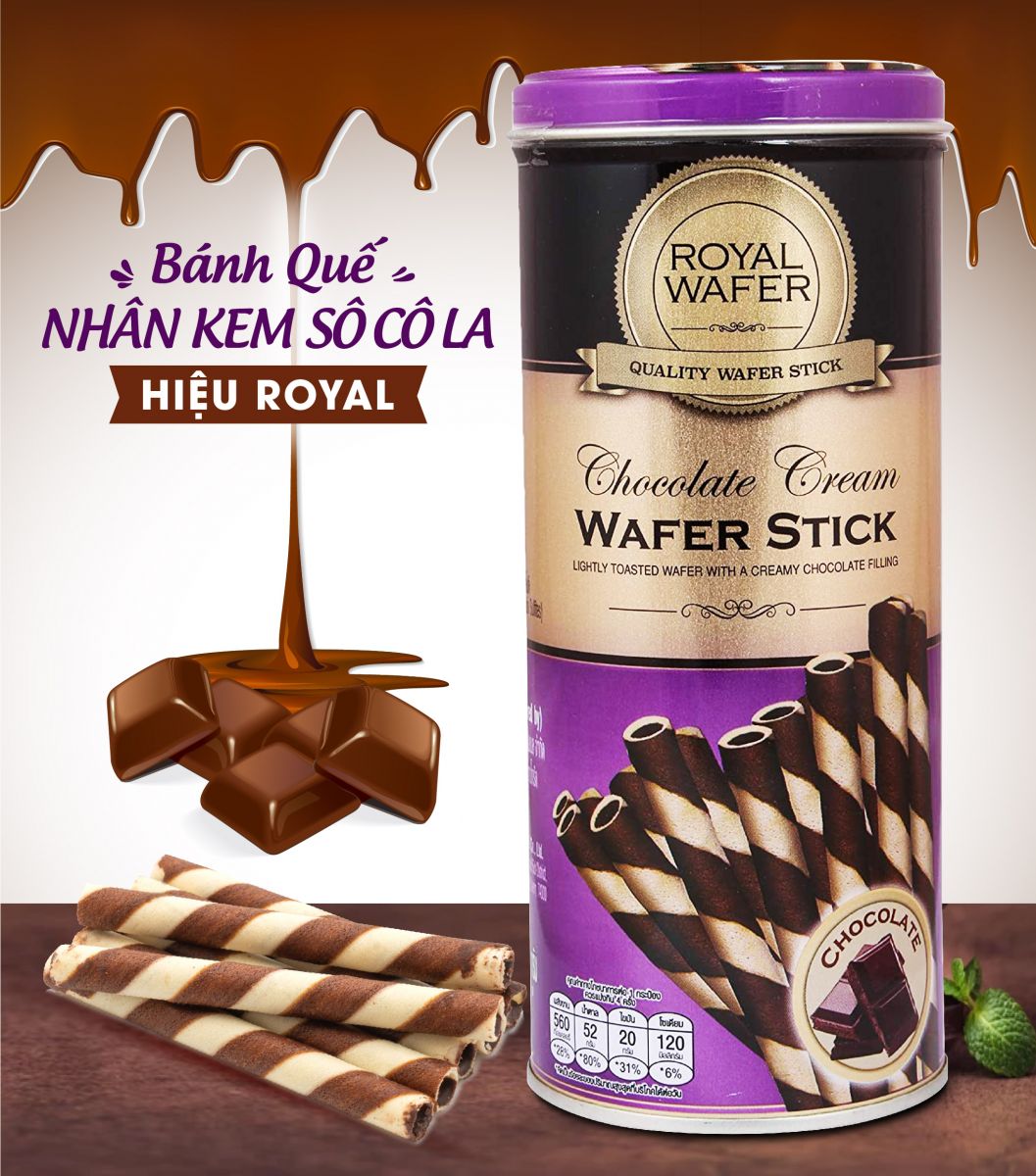 Bánh quế nhân kem sô cô la hiệu Royal được chế biến từ những nguyên liệu thượng hạng với hương vị thơm ngon, hấp dẫn. Bánh có hình ống độc đáo, vỏ bánh xốp, giòn tan, nhân kem sô cô la thơm lừng. Bánh quế chứa nhiều Vitamin và khoáng chất như Canxi, Vitamin D, E và chất xơ giúp xương chắc khỏe.Sản phẩm được sản xuất trên dây chuyền công nghệ tiên tiến, hiện đại, đảm bảo mang đến cho bạn những chiếc bánh thơm ngon tuyệt hảo. Bánh được bảo quản trong gói nhỏ gọn, tiện dụng để bạn có thể mang theo cùng đến bất cứ nơi đâu.
