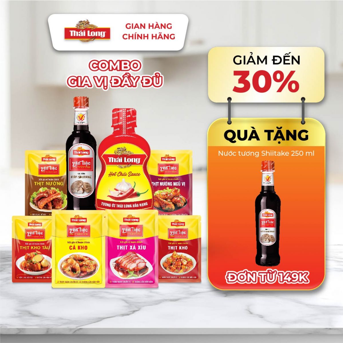 Combo 3 (Tương ớt Hảo Hạng 250gr - Nước tương nấm Shiitake 250ml - 6 xốt gia vị Thái Long Yến Tiệc) Sản phẩm có trong combo: 06 gói xốt nấu ăn Thái Long: được pha chế sẵn từ gia vị truyền thống, tỏi, hành, tiêu, ngũ vị hương… giúp nấu nhanh mà vẫn chuẩn vị. Bao gồm